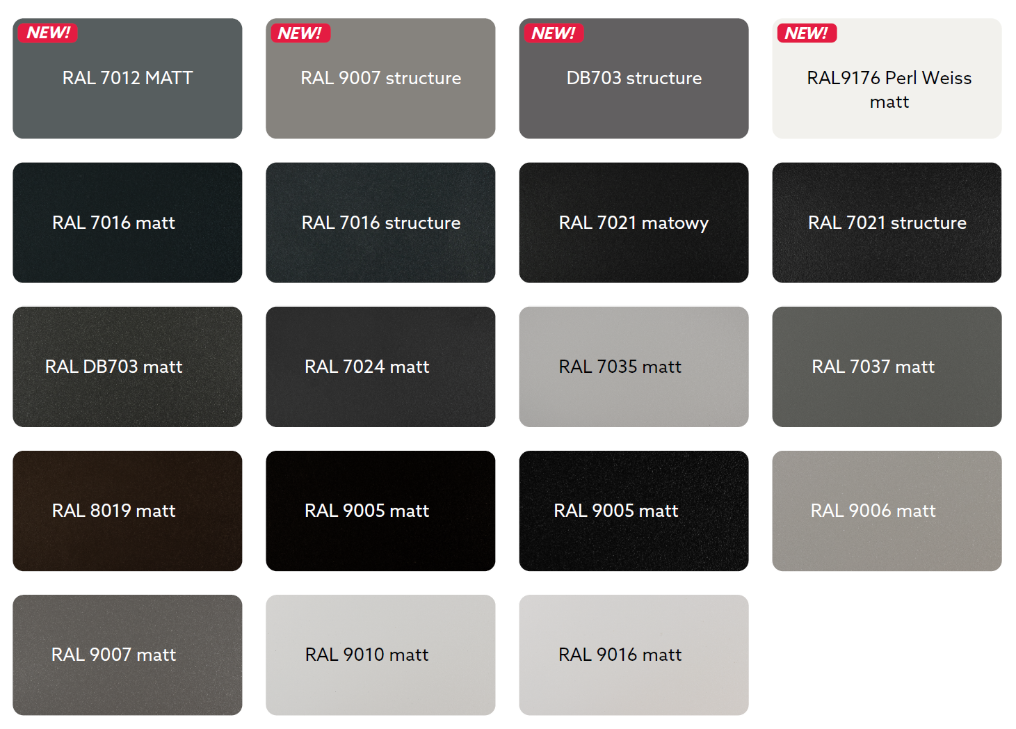 Standardní barvy z nabídky Yawal jsou dostupné v několika povrchových úpravách obsahujících mat, lesk a strukturu.
