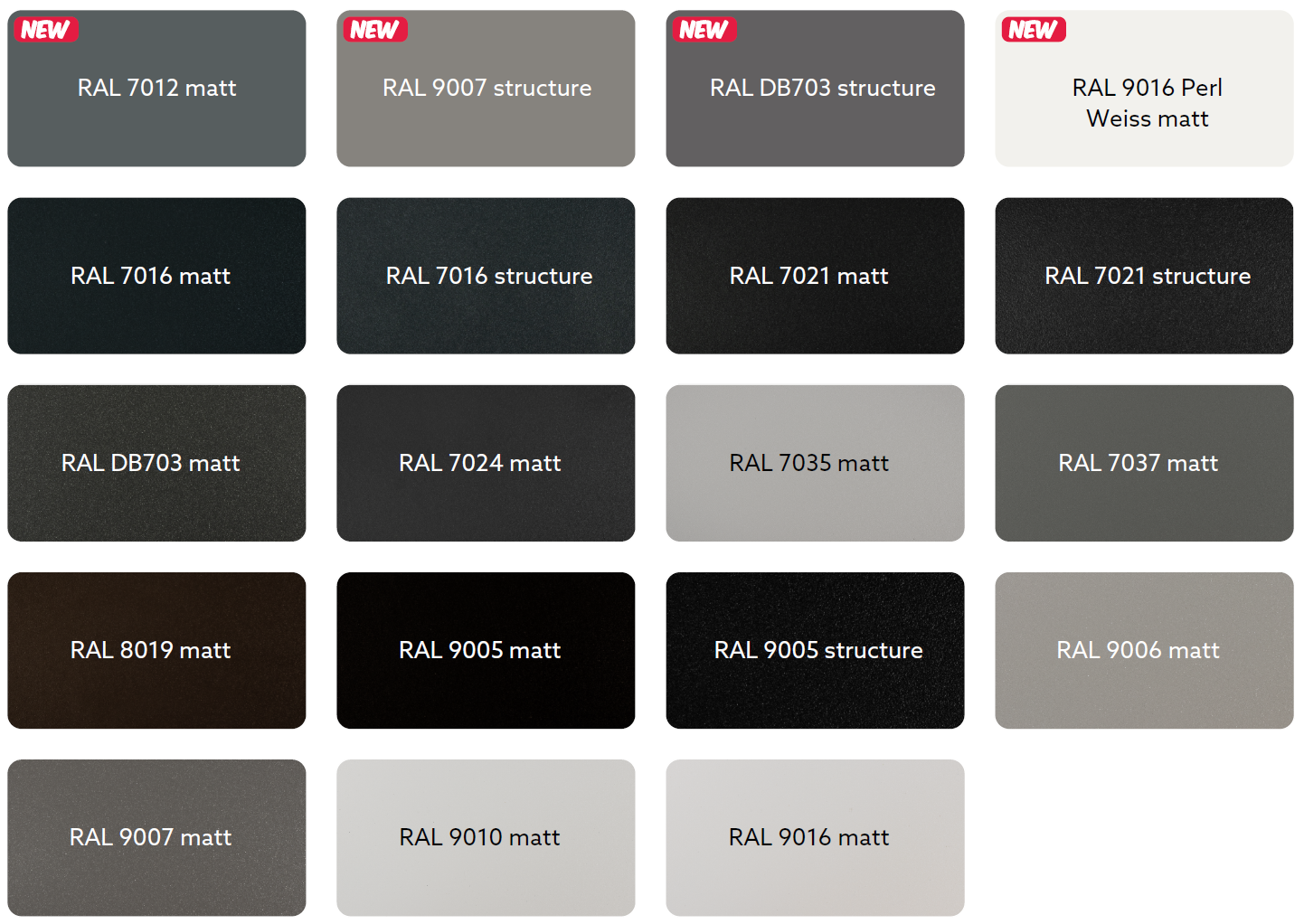 A Yawal termékcsalád standard színei többféle kivitelben kaphatók, köztük matt, selyemfényű és struktúra kivitelben