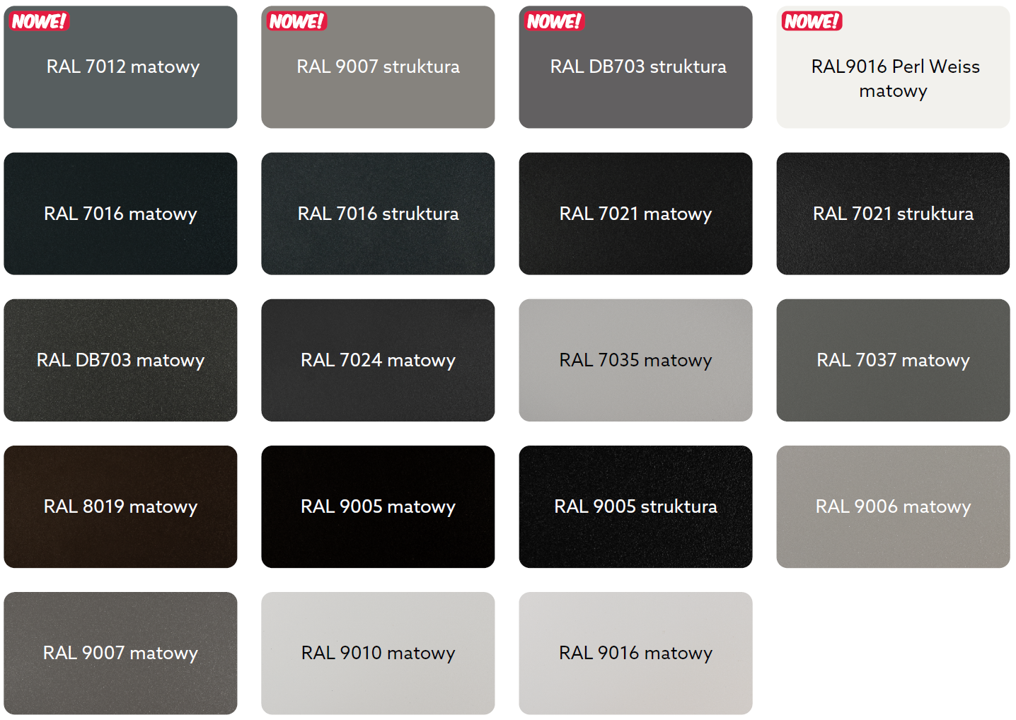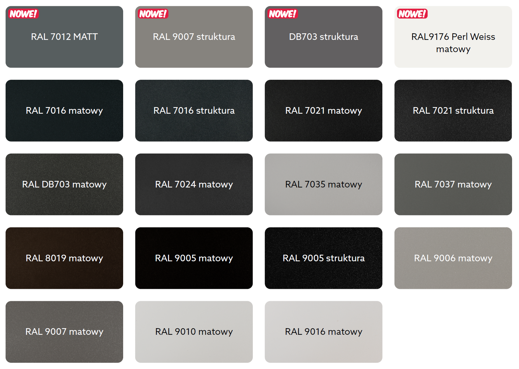 Kolory standardowe z oferty Yawal dostępne są w kilku wersjach wykończenia obejmujących mat i strukturę.